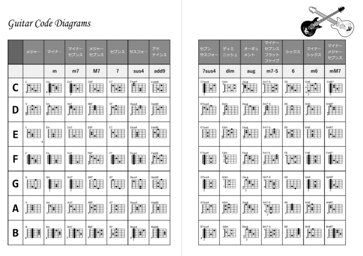 手帳にありがちな路線図や干支・六曜の代わりに、ギターコードダイアグラムを付けました。